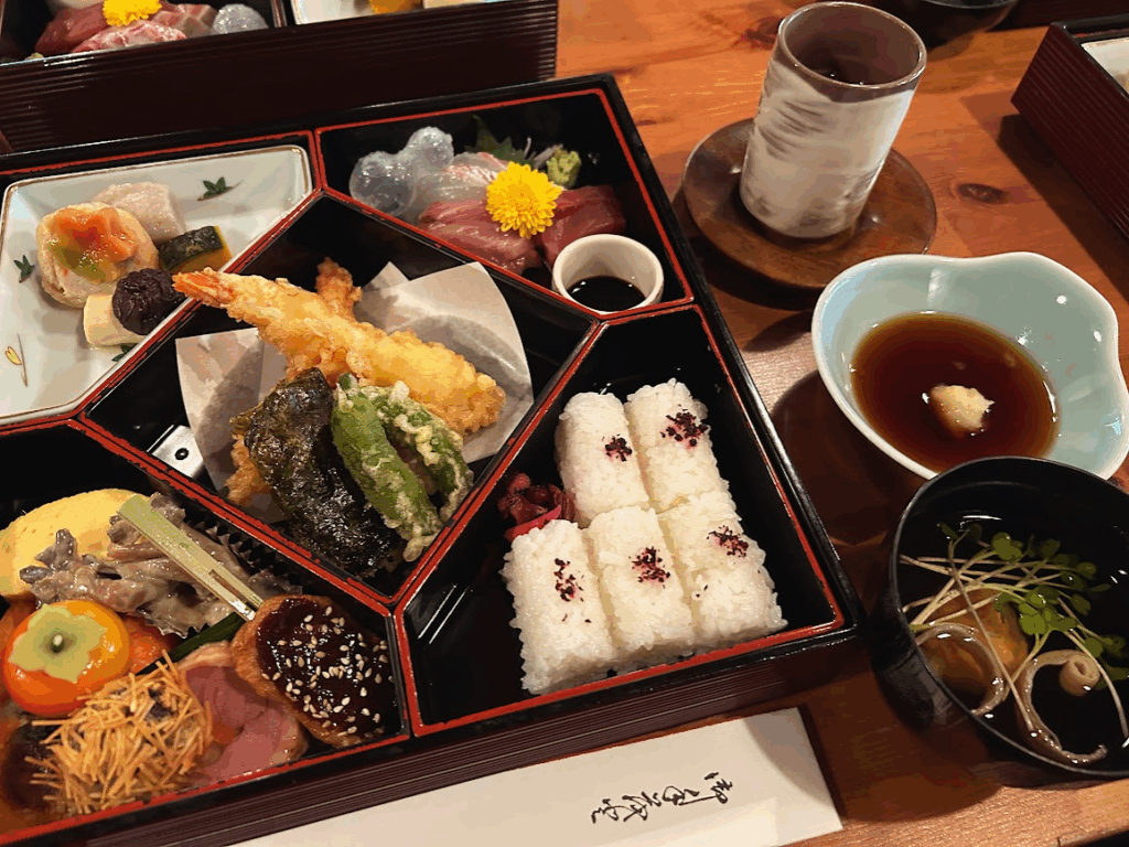 昼食は、蓋を開けた瞬間に「わぁ~」と声が上がるほど豪華なお弁当。