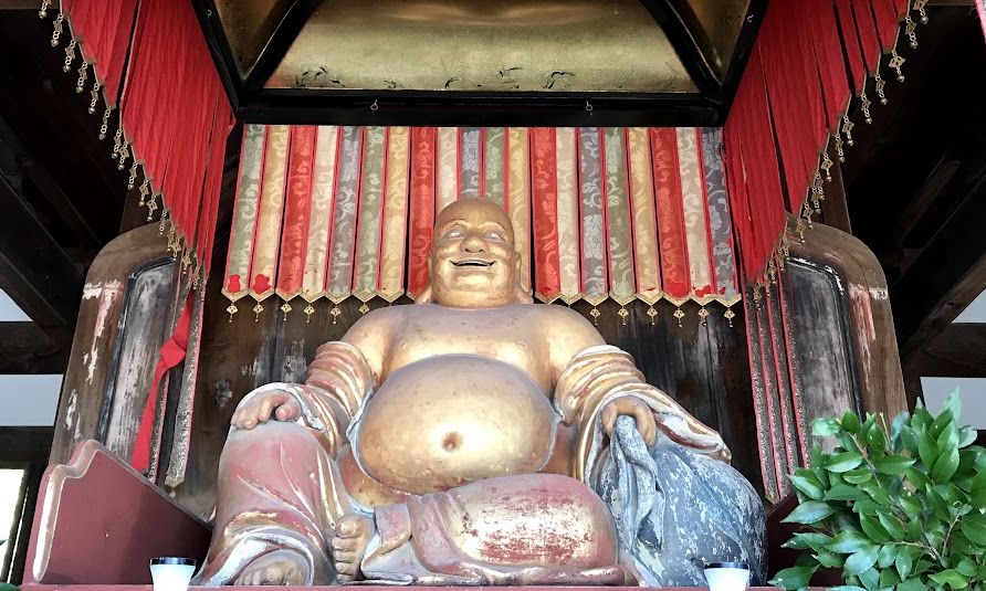山門をくぐると、2024年に国宝に認定された天王殿、そして大雄宝殿、法堂と続きます。チーク材で造られた建物や赤枠の丸窓が異国の気配が漂います。天王殿で満面の笑みをたたえる黄金の布袋さん(弥勒菩薩坐像)には、日本によくある仏像とは一味違う陽気さに心が掴まれます。